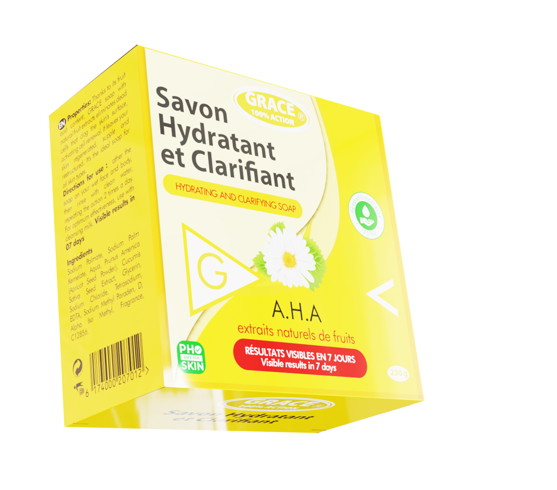 Le produit GRACE Savon hydratant et clarifiant AHA 230 Gram (marque GRACE) est identifié de manière unique par le GTIN (EAN-13) : 6174000207593, conformément aux standards GS1. Cette page constitue la fiche de référence pour l'identification normalisée de ce produit et de ses caractéristiques. La marque est la propriété de B&B SARL.
