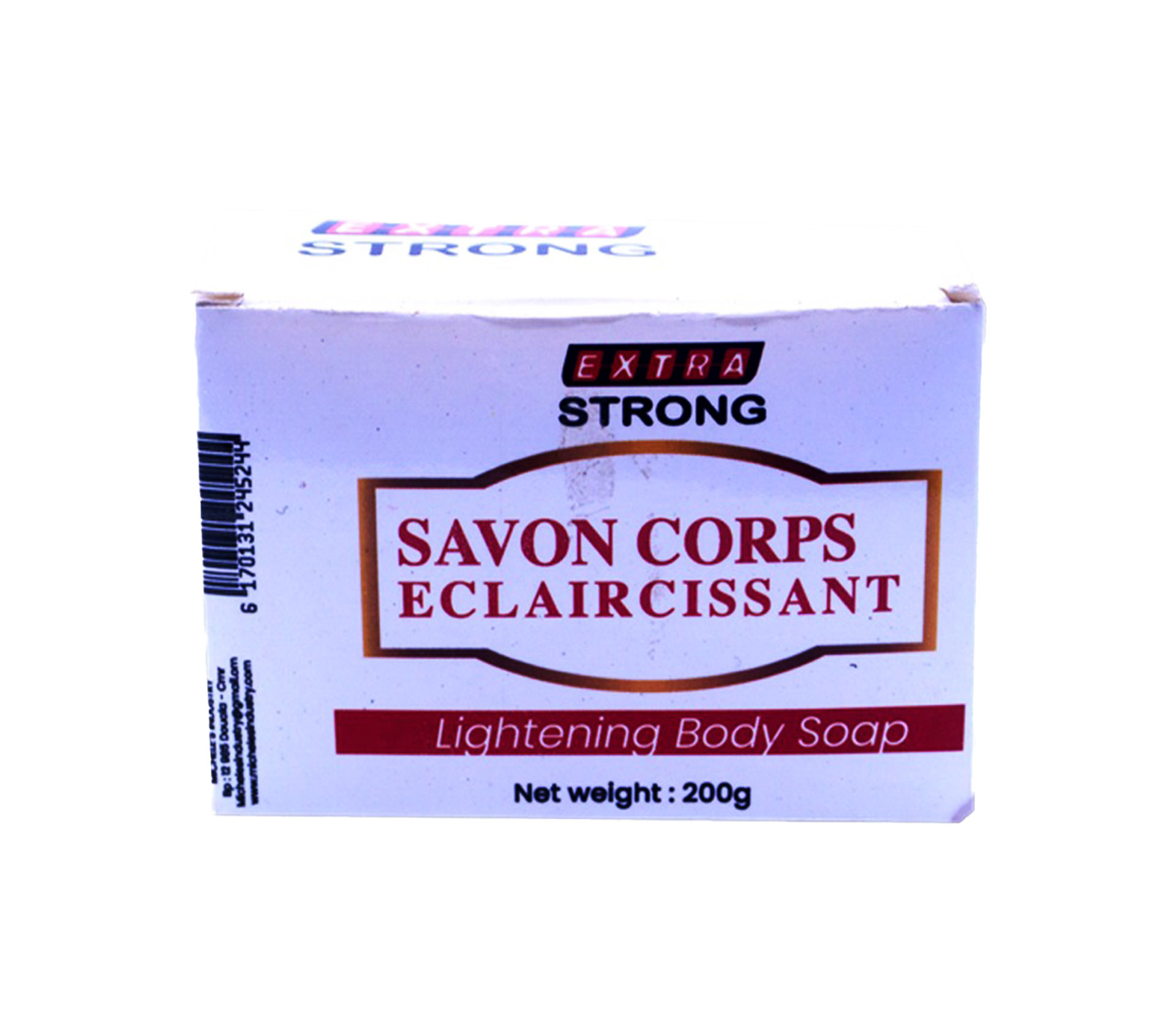 Le produit EXTRA STRONG Savon Éclaircissant 200 Gram (marque EXTRA STRONG) est identifié de manière unique par le GTIN (EAN-13) : 6174000219022, conformément aux standards GS1. Cette page constitue la fiche de référence pour l'identification normalisée de ce produit et de ses caractéristiques. La marque est la propriété de MICHELE’S INDUSTRY.
