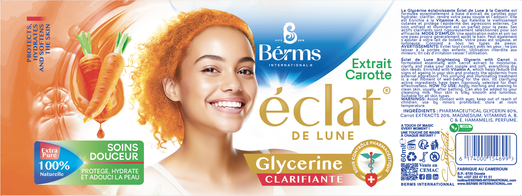 Le produit BERMS Eclat de Lune Glycérine Clarifiante Carotte Carotte 60 millilitre (marque BERMS) est identifié de manière unique par le GTIN (EAN-13) : 6174000270269, conformément aux standards GS1. Cette page constitue la fiche de référence pour l'identification normalisée de ce produit et de ses caractéristiques. La marque est la propriété de CCRC COSMETICS.