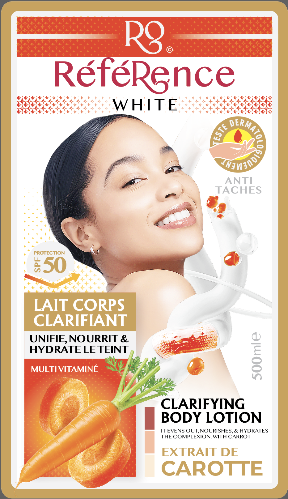 Le produit référence White Lait Corps Clarifiant Uniformisant, Nourrissant et Hydratant Extrait de Carotte, Multivitaminé 500 millilitre (marque référence White) est identifié de manière unique par le GTIN (EAN-13) : 6174000270481, conformément aux standards GS1. Cette page constitue la fiche de référence pour l'identification normalisée de ce produit et de ses caractéristiques. La marque est la propriété de CCRC COSMETICS.