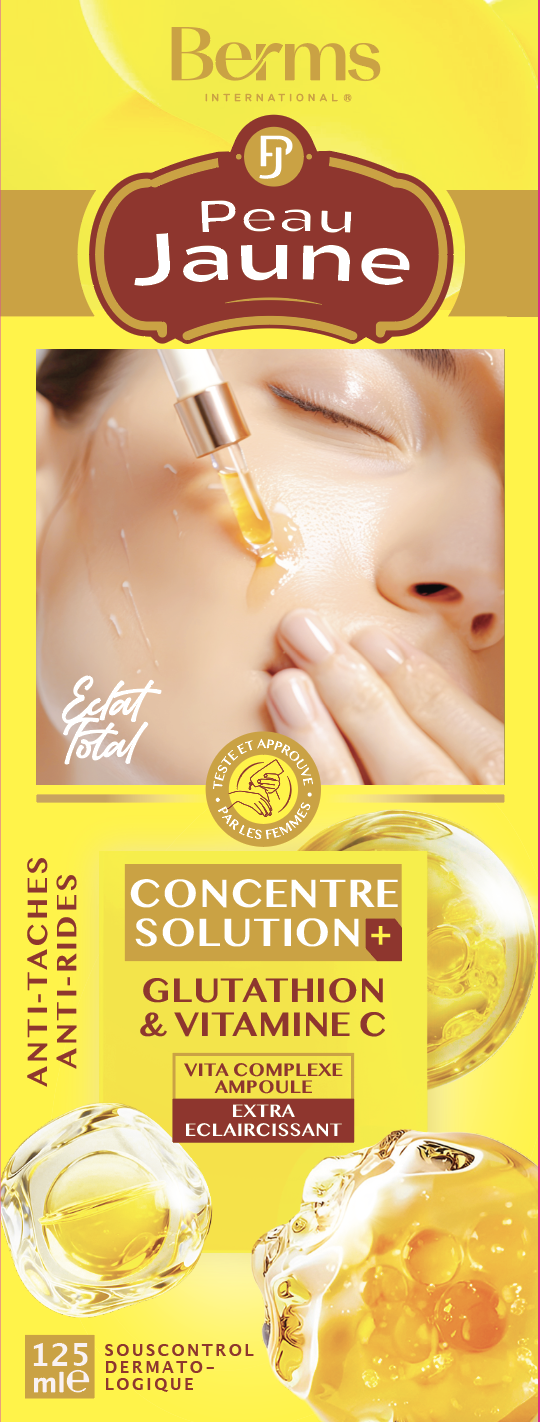 Le produit BERMS PEAU JAUNE Concentré Solution+ Glutathione & Vitamine C Vita Complexe, extra Eclaircissant, Anti-Tâches 125 millilitre (marque BERMS) est identifié de manière unique par le GTIN (EAN-13) : 6174000270580, conformément aux standards GS1. Cette page constitue la fiche de référence pour l'identification normalisée de ce produit et de ses caractéristiques. La marque est la propriété de CCRC COSMETICS.