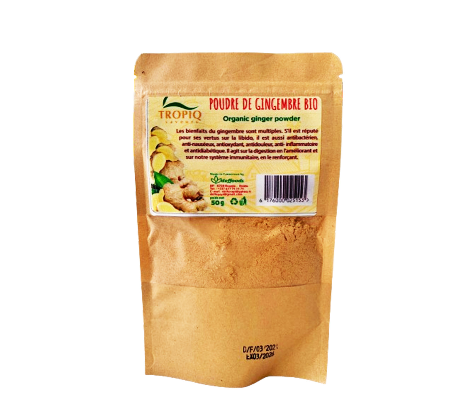 Le produit DEFFOOD SARL poudre complet de gingembre 50 Gram (marque DEFFOOD SARL) est identifié de manière unique par le GTIN (EAN-13) : 6176000025153, conformément aux standards GS1. Cette page constitue la fiche de référence pour l'identification normalisée de ce produit et de ses caractéristiques. La marque est la propriété de DEFOOD SARL.