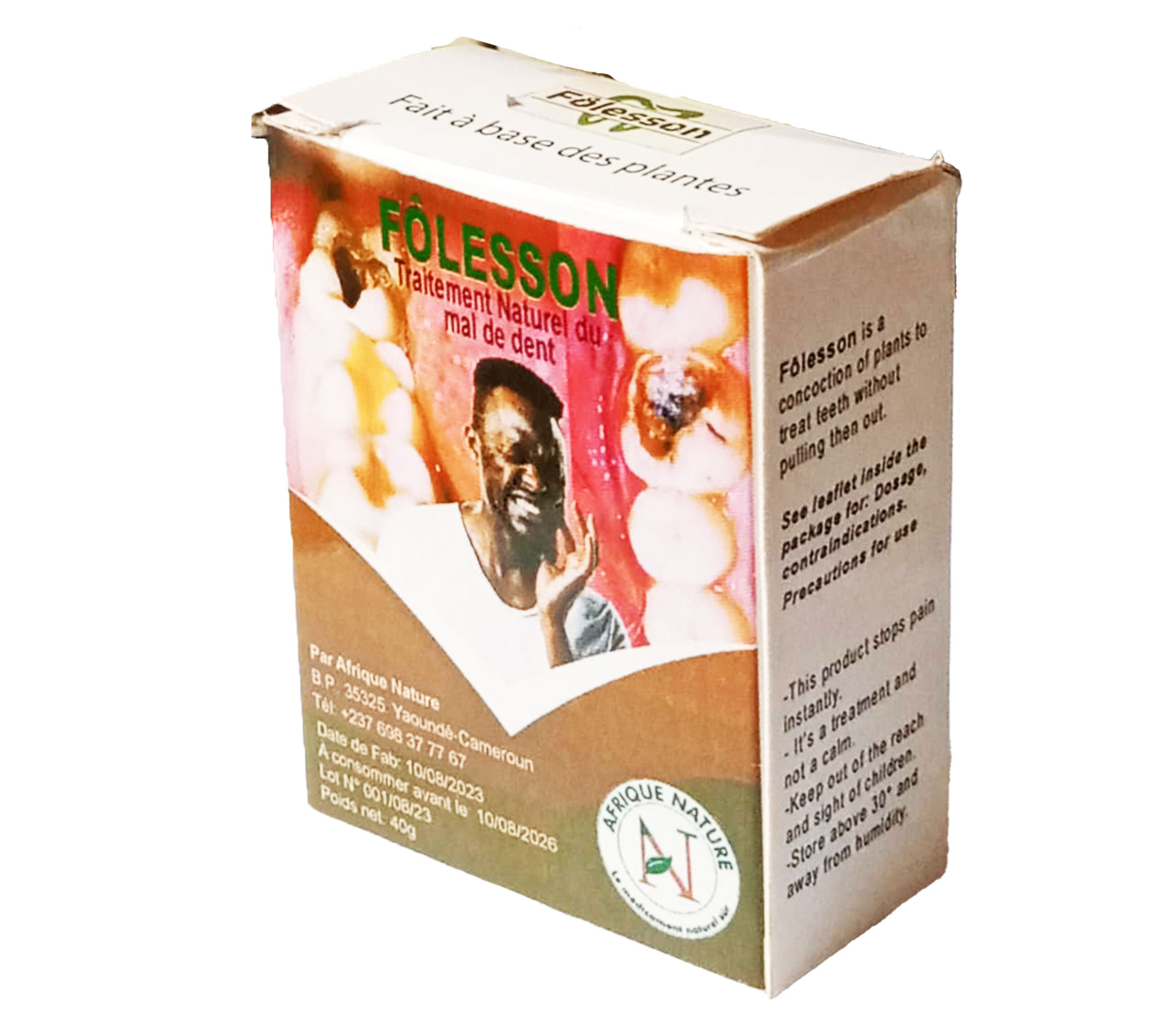 Le produit AFRIQUE NATURE FÔLESSON Traitement mal de dent Poudre 40 Gram (marque AFRIQUE NATURE) est identifié de manière unique par le GTIN (EAN-13) : 6176000095958, conformément aux standards GS1. Cette page constitue la fiche de référence pour l'identification normalisée de ce produit et de ses caractéristiques. La marque est la propriété de AFRIQUE NATURE.