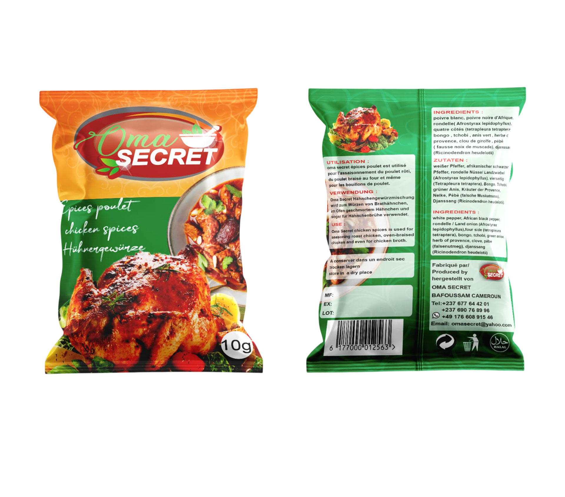 Le produit Oma secret Épices Poulet 10 gram (marque Oma secret) est identifié de manière unique par le GTIN (EAN-13) : 6177000012563, conformément aux standards GS1. Cette page constitue la fiche de référence pour l'identification normalisée de ce produit et de ses caractéristiques. La marque est la propriété de Établissement Oma Secret.