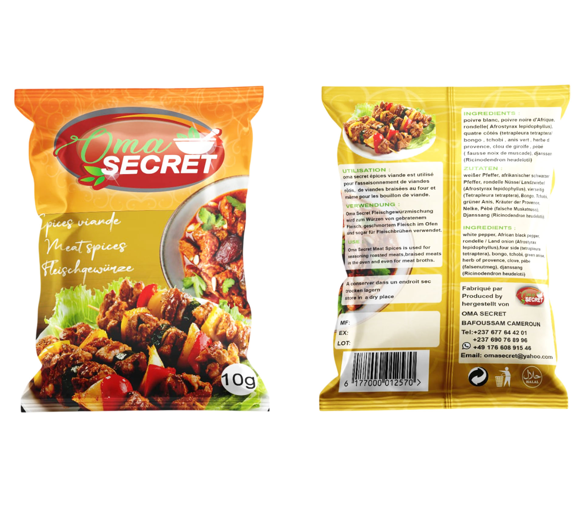 Le produit Oma secret Épices Viande 10 gram (marque Oma secret) est identifié de manière unique par le GTIN (EAN-13) : 6177000012570, conformément aux standards GS1. Cette page constitue la fiche de référence pour l'identification normalisée de ce produit et de ses caractéristiques. La marque est la propriété de Établissement Oma Secret.
